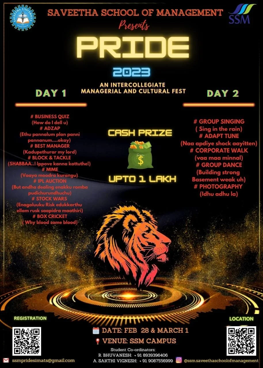 Pride is a unique intercollegiate management and cultural fest hosted by Saveetha School of management.