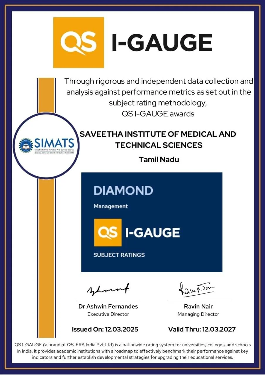 SIMATS School of Management proudly holds the prestigious QS I-GAUGE Diamond Rating, a testament to its commitment to global academic excellence and quality benchmarks.