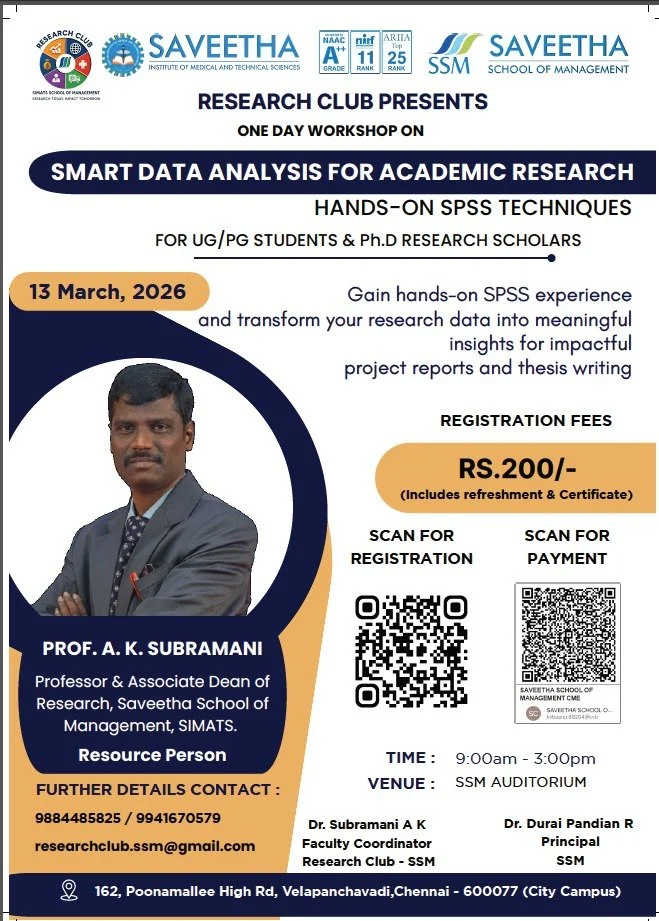 SSM-SIMATS organizing FDP on “Ethical Use of AI Tools in Research paper writing” through Hybrid mode both Onine and offline on 03.09.2025. Having chief guest as Dr.M.I.KAROBARI - Associate dean of research , Professor & Head (Conservative Dentistry & Endodontics, Saveetha Dental College & Hospitals, SIMATS, Chennai.